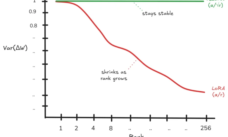 However, as the industry moved toward higher-rank adaptations to capture more complex task nuances, a fundamental flaw in the original LoRA formula was identified. The standard LoRA approach uses a scaling factor of $alpha/r$ (alpha divided by rank) to integrate fine-tuned weights. Mathematical analysis and empirical testing have shown that as the rank ($r$) increases, the variance of the weight updates decreases. Specifically, the variance of the product of the low-rank matrices ($B times A$) is proportional to $r$. When this is multiplied by the scaling factor squared ($(alpha/r)^2$), the resulting variance of the weight update ($Delta W$) becomes proportional to $1/r$.