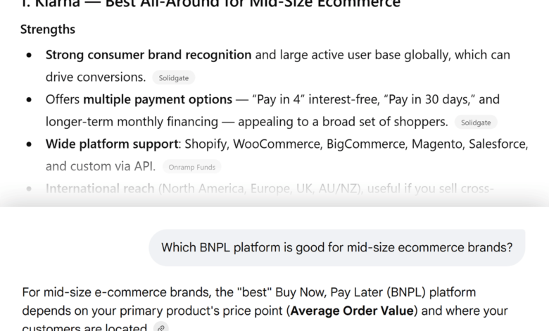 Product recommendations are the most influential type of AI visibility, occurring when AI systems include a fintech brand or product in a curated shortlist of suggested options. These recommendations directly shape which brands users consider during their decision-making process and ultimately, which products they choose. For instance, a query like "Which BNPL platform is good for mid-size e-commerce brands?" might result in both ChatGPT and Google AI Mode listing Klarna as a top contender. This direct recommendation positions the brand prominently as buyers evaluate their choices.