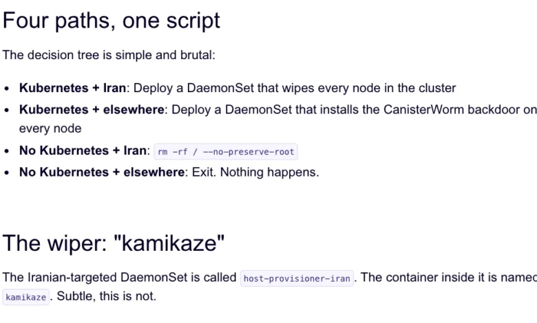 The same technical infrastructure that TeamPCP utilized in the Trivy attack was later leveraged to deploy a new malicious payload. This payload, identified as a data-wiping worm, was designed to execute its destructive function if it detected that a system’s configuration matched Iran’s time zone or had Farsi set as the default language.